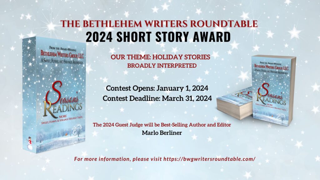 We are seeking never-published short stories of 2,000 words or fewer. First Place will receive $250 and publication in the upcoming anthology: Season’s Readings: More, Sweet, Funny, and Strange Holiday Tales or in The Bethlehem Writers Roundtable.